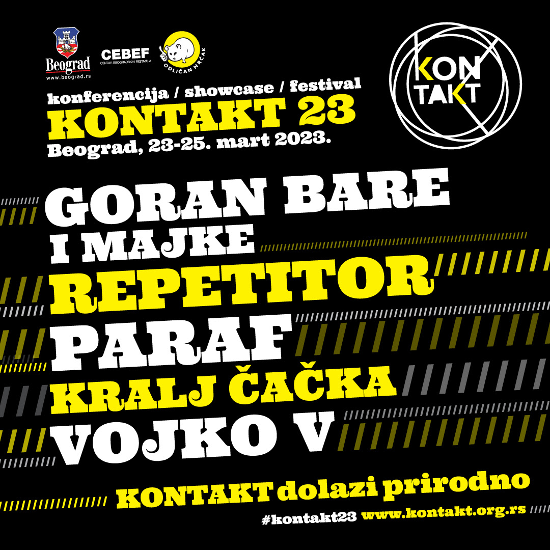 Kontakt konferencija, showcase i festival održaće se sedmi put u Beogradu. #Kontakt23 očekuje nas od 23. do 25. marta 2023. u organizaciji producentske kuće „Kontakt konferencija“, promoterske kuće Odličan Hrčak i Centra beogradskih festivala – CEBEF, pod pokroviteljstvom grada Beograda.